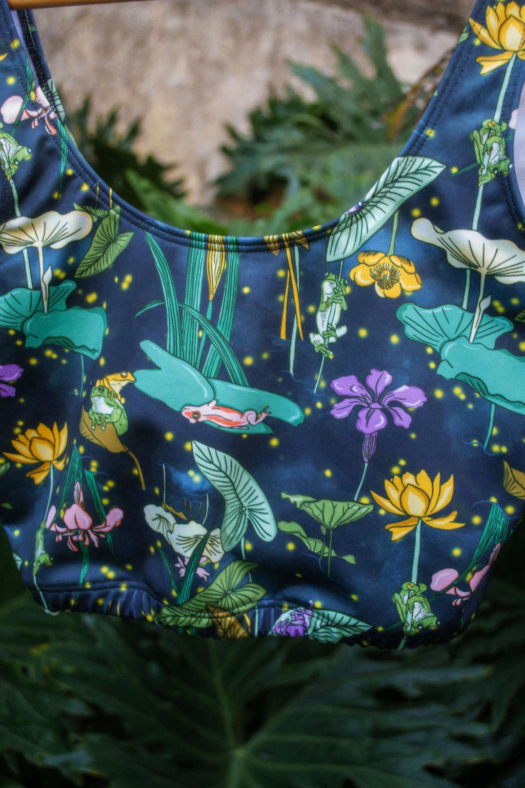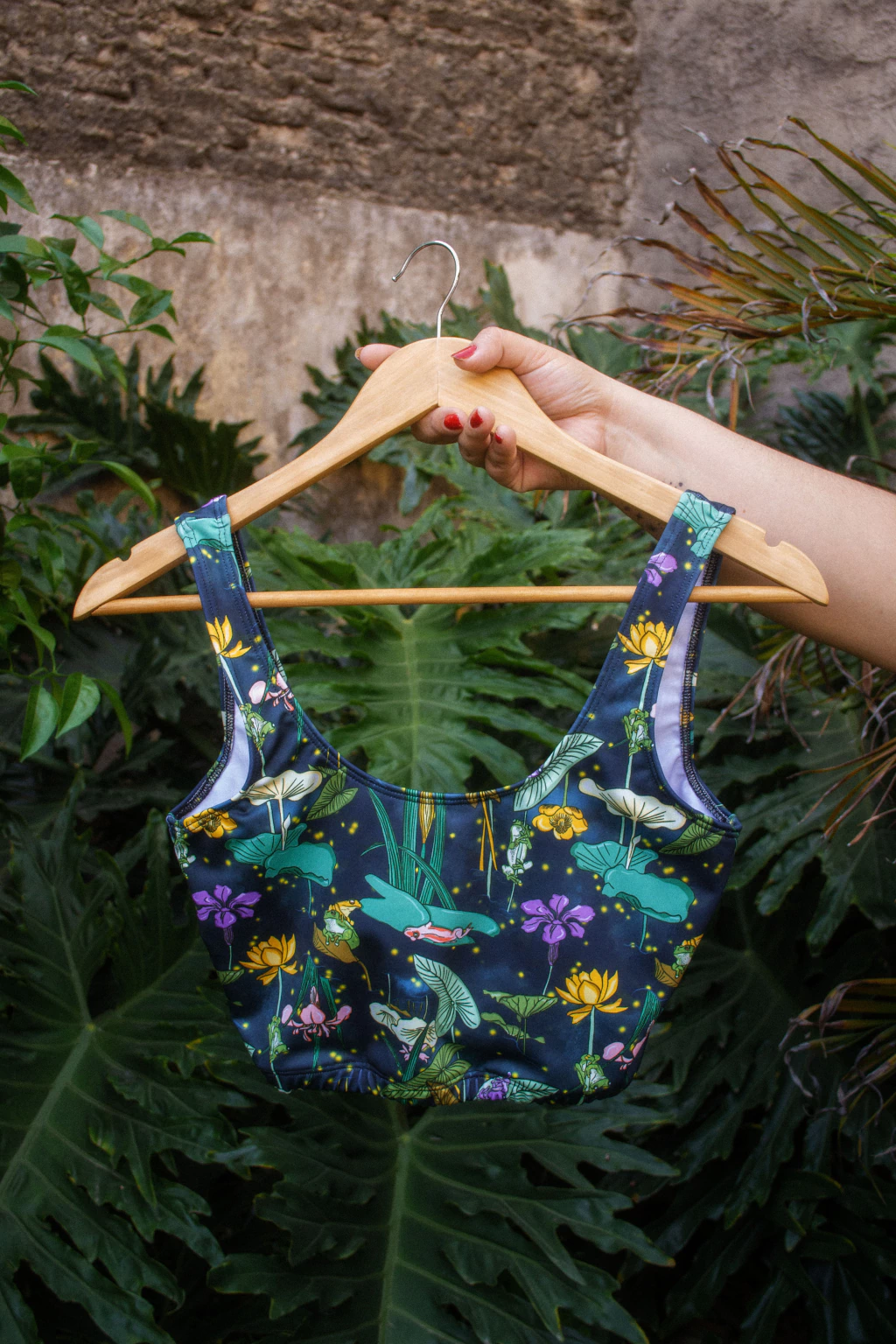 Top en lycra estampada con tecnología UV50+, ideal para estar al aire libre, ya que protege del sol.